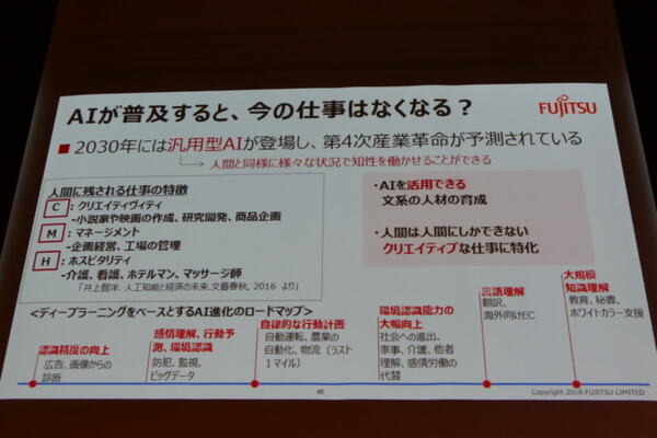 そのほか、働き方に関する事例やニュース記事の自動要約(http://pr.fujitsu.com/jp/news/2018/01/15.html)、レーダー画像からの路面下空洞の自動検知(http://pr.fujitsu.com/jp/news/2017/05/15-2.html)、橋梁の内部損傷の推定(http://pr.fujitsu.com/jp/news/2017/08/28.html)など、各種AI技術活用の事例を紹介した。