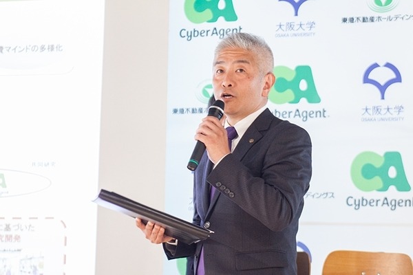 共同記者発表会には、大阪大学基礎工学研究科教授の石黒氏、サイバーエージェント上級執行役員 内藤氏、東急不動産R&Dセンター取締役 山内氏が登壇し、実証実験の背景や目的、今後予定している展開、人型ロボットのサービス業界における活用の可能性について説明、人型ロボットによるデモンストレーションも行った。