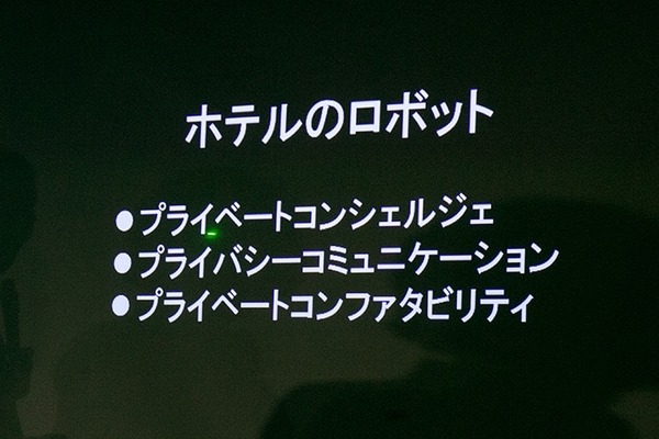 ホテルのロボットに注目した場合、石黒教授は「プライベートコンシェルジェ」「プライバシーコミュニケーション」「プライベートコンファタビリティ」の3つが重要なポイントとした。