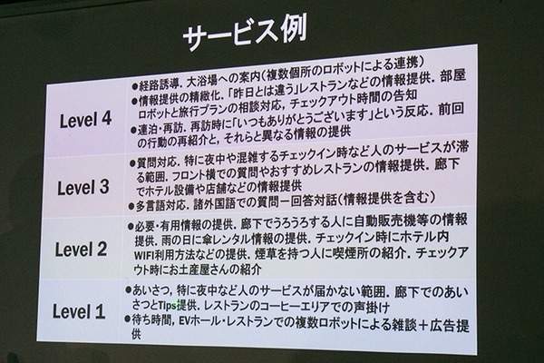 また、達成すべきサービスとして、レベル1は「挨拶、待ち時間の雑談」、レベル2は「必要な情報の提供」、レベル3は「顧客の質問に対応」、レベル4は「顧客の目的地までの経路の誘導」と具体例を示した。例えば、レベル2では「雨が降ってきたら、傘の提供をロボットがアナウンス」するなどが具体例のひとつであり、高度なレベルとして達成したのは、ホテル内の複数のロボットが連携して、お客様を誘導したり、適切な案内を行うことだとした。