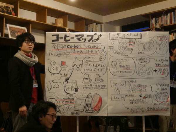 特大の手書きイラストで説明したのは「Coffee Drop」チーム。