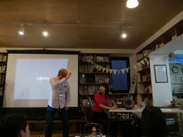 コーヒーの持つソーシャル性などの、商品背景だけでなく、様々な事例を説明することで、参加者にアイデアの種をまく小原さん。