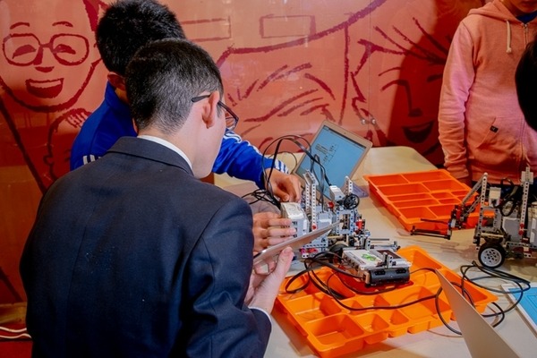 電子技術研究部の高校生たちは今年3月、同じく豊洲にある「キッザニア東京」にて、レゴの中学生向けのワークショップを行なっていた。これはキッザニア中学生限定の日「第5回 ジュニア チャレンジ ジャパン」で行われたワークショップで、芝浦工大附属高校の生徒たちが中学生を相手にロボットのプログラミングを丁寧に教えていた。