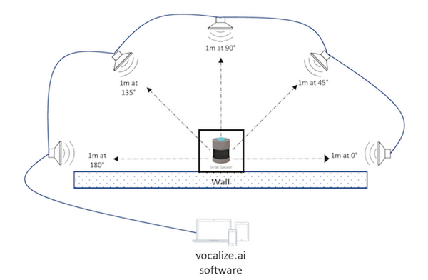 テスト内容は、独立した単語の認識テスト、音声認識のしきい値テスト、ウェイクワードのしきい値テストの3つ。テストセットアップは、0度、45度、90度、135度および180度の位置に1m離れた場所に各スマートスピーカーを配置する以下の図の方法で行われた。