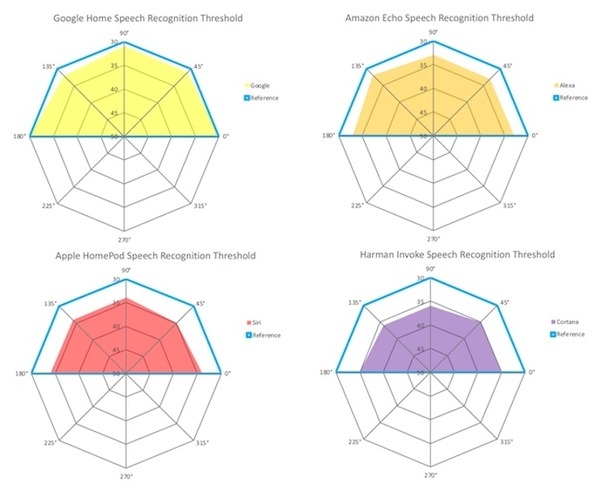 このテストはスマートスピーカーのマイクアレイ性能を測定するのものであり、音声アシスタントが少なくとも50%の精度で音声を認識できる音圧(デシベル)を測定した。図の外側の青い線は30デシベルで標準的な人間の聴力の基本性能を示しており、空白が少ないほう(=30デシベルに近いほう)が優秀なパフォーマンスである。