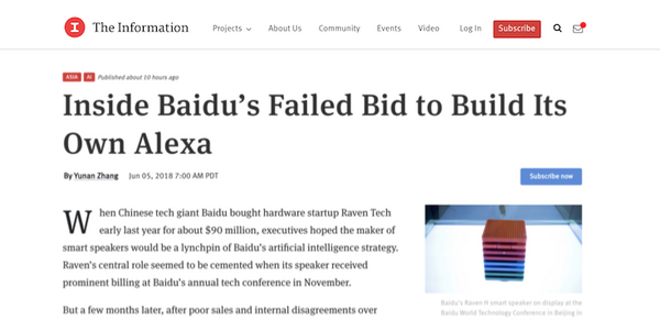 報道によれば、ライバルのAlibaba Tmall Genieは200万台出荷されているところ、Baidu Raven Hは10,000台しか出荷されていないという。