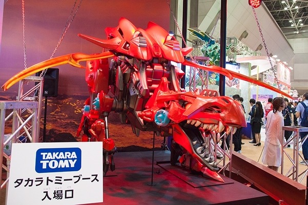 開催中の「東京おもちゃショー2018」のタカラトミーのブースでは、入口にZOIDSコーナーが設けられ、迫力のある巨大なワイルドライガーとギルラプターが来場者を迎えている。