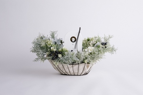 まるで両親への感謝を一つ一つ摘んできたような バスケット型の「Chloe」 トレンドの白×グリーンのブーケのような仕上がりはどんなウェディングドレスでも似合うだろう。