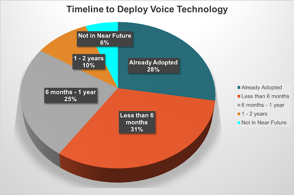 音声技術の導入時期については、28%がすでに使っている、85%が来年には導入予定と回答した。家庭へのスマートスピーカーの普及ペース以上に、企業での音声技術採用が加速するということになる。