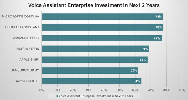 ここ2年でどの音声アシスタントに投資するかについて聞いたところ、Microsoft Cortana、Google Assistant、Amazon Alexaが上位3アシスタントとなった。ついでIBM Watson、Apple Siriと続いた。どのアシスタントにせよ投資される可能性が非常に高い領域であることがわかる。またこの投資傾向からわかるのは、企業はひとつのアシスタントに絞らず、ユーザーニーズ似合わせて複数のアシスタントに対応していくのがここしばらくの流れとなりそうだ。