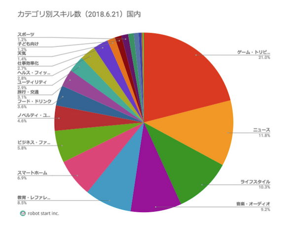 カテゴリ別に見るとゲーム・トリビア・アクセサリ、ニュース、ライフスタイル、音楽・オーディオと続き、上位4カテゴリでスキルの過半数を占めている。またまだ数は少ないものの新カテゴリ「子ども向け」も伸びているカテゴリだ。