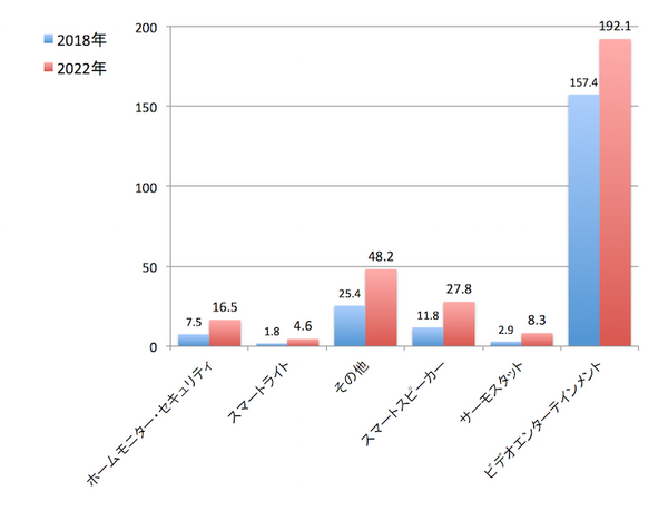 まずスマートホームデバイスの中で、ビデオエンターテインメントの売上の大きさがわかる。スマートスピーカーは注目されているが、売上規模、年成長率のいずれにおいてもスマートホームデバイスの中でトップではない。