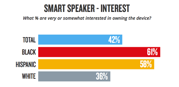 スマートスピーカーに興味を持つ人は、ブラック・ヒスパニックがホワイトを大きく上回った。ブラック61%、ヒスパニック58%に対して、ホワイトのみが36%と少ない結果だった。