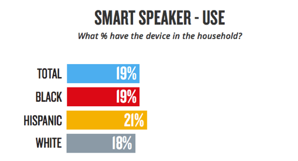 スマートスピーカーの利用率ではヒスパニック、ブラック、ホワイトの順。前述のスマートスピーカーに対する興味と比べると人種間での差はそれほどない。興味のある人に比べて利用者はまだ少ない状況にある。