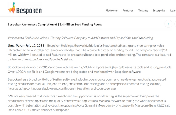 2018年7月12日、音声スキル・アプリ開発者向けのツールを提供するスタートアップ「Bespoken」が240万ドル(日本円でおよそ2.7億円)のシードラウンドでの資金調達を完了したことを発表した。