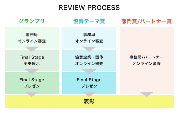 スケジュールは、10月10日が申込締切、11月10日にFinal Stage、審査プロセスは以下の通り。