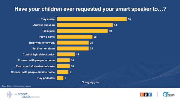 音楽再生、一般的な質問、ジョークが子ども向けのタスクとして上位となった。