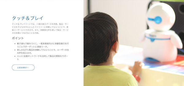 Robo&Peaceでは、体験型展示を通じた実証・マーケティングのサポートの他、ワークショップ開催のサポート、マッチングなどで支援していく。