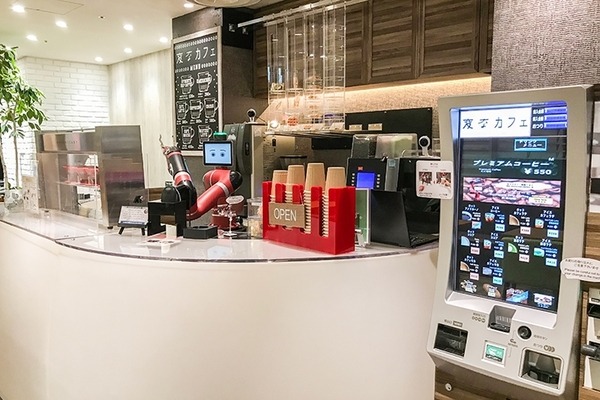 「変なカフェ」には「いろいろなコーヒーを入れるロボット」システムが稼働している。2008年にブルックス氏らが設立した米Rethink Robotics(リシンク・ロボティクス)社の産業用ロボット「Sawyer」(ソイヤー)を使って、QBIT Robotics(キュービット・ロボティクス)社が携わり、H.I.S.が開発した。「変なカフェ」で導入され、稼働していることがSNSで世界的に拡散され、それがブルックス氏の目にとまった。ブルックス氏は「実際に見てみたい」と希望し、講演のために来日した今回、「変なカフェ」を訪れたのだ(関連記事「ロドニー・ブルックス博士が「変なカフェ」でコーヒーを入れるロボットを視察 ~ルンバの開発で知られるロボット研究の権威」)。