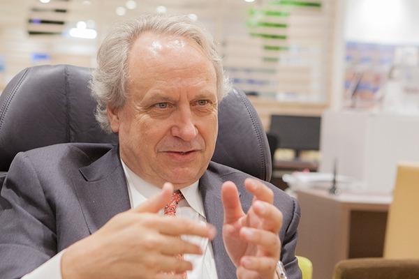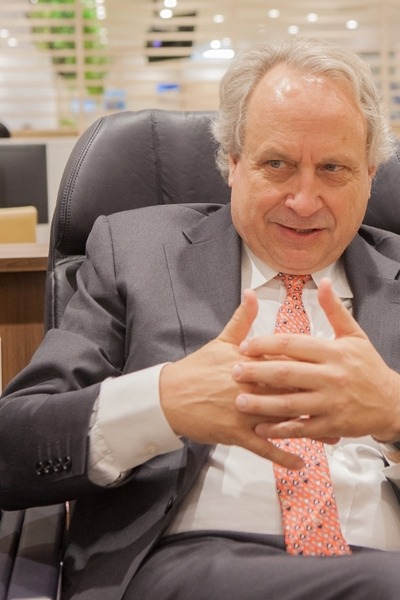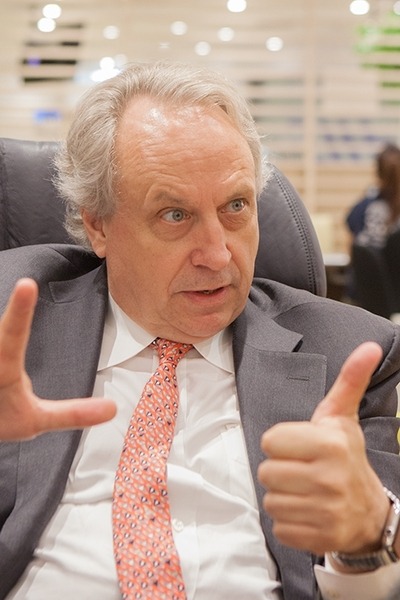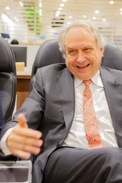 ブルックス博士はロボット視察後、プレスのインタビューに応えた。