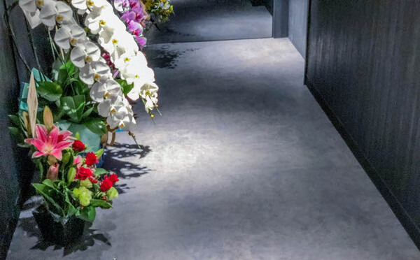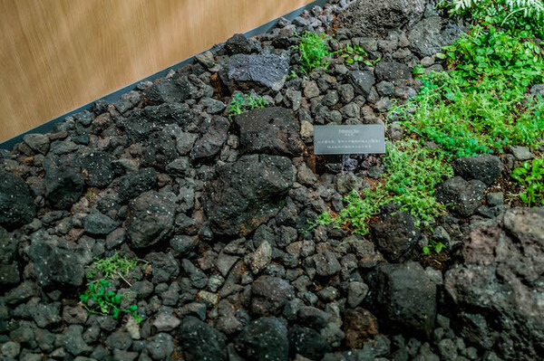 通路を抜けると新しいエントランスに到着する。溶岩石の間から水が湧いており、その水の流れる音が印象的だ。また植物とその立体的な配置に圧倒される。壁に照らされた光と立体的な壁面緑化が組み合わさって「X」の文字を表現しているという。