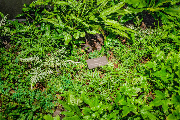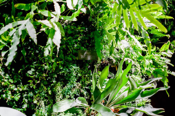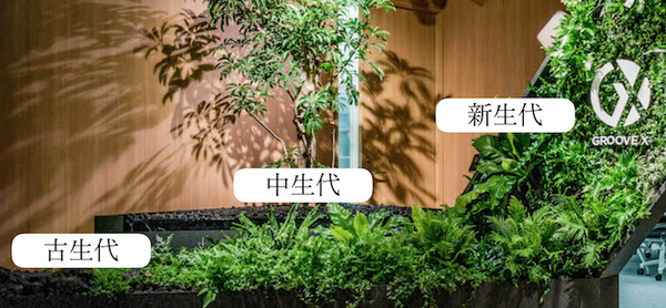 壁面緑化は、無造作に植物を埋め込んだものではなく、植物の歴史、進化を表現したこだわりのあるものだ。古生代、中生代、新生代の3つの歴史をシダ類を中心に配置して右に進むに従って進化した植物が植え込まれている。