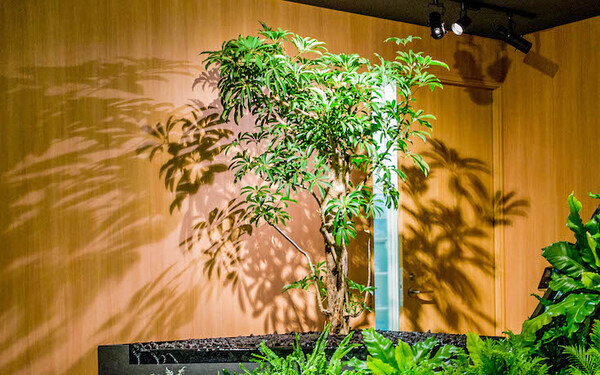 エントランスの中央にシンボルツリーが植え込まれている。GROOVE Xが掲げる「新しい産業を創出したい」という思いを込めて、長い年月と生命力を感じさせるシェフレラが選ばれたという。