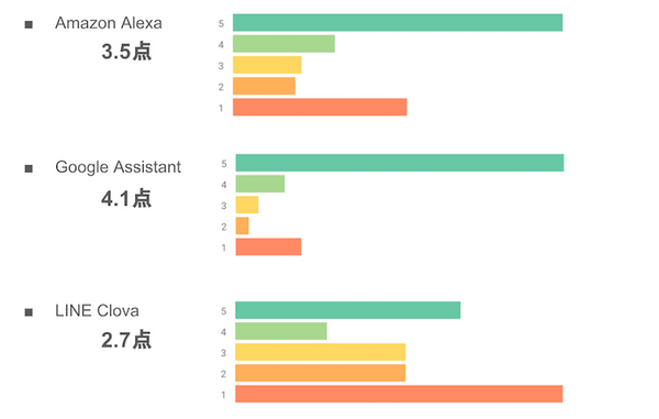 Amazon AlexaはOSによる差が大きく、iOSでは最低点だがAndroidは高得点を得ている。
