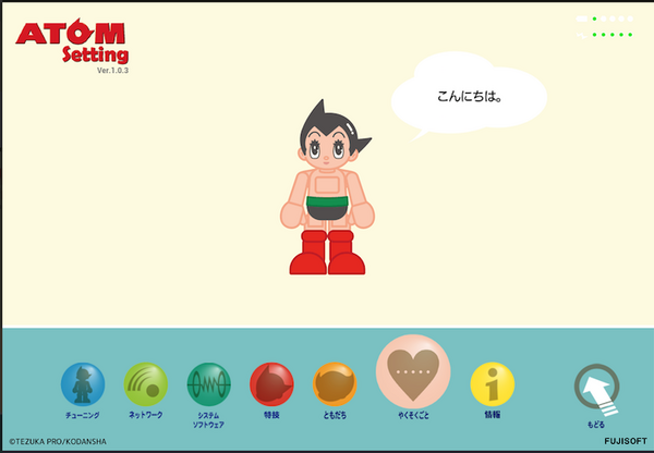 「ATOM Setting」は、コミュニケーションロボット「ATOM」の状態を、目で見て指先で簡単に変えることができるアプリ。ATOMのネットワークやメール設定、設置場所の情報、友だちの情報、ATOMが発話する自己紹介の内容や特技の編集などを簡単に行なうことができる。画面上にATOMが出てくる、楽しいインターフェースだ。