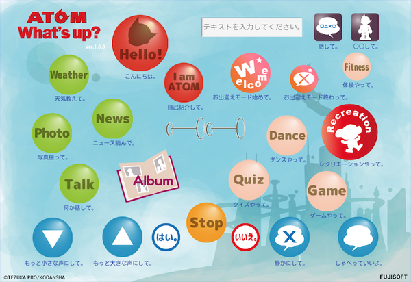 「ATOM What’s up?」は、「ATOM」をリモコン操作できる、楽しくて便利なアプリ。好きなセリフをATOMに喋らせることが可能で、イベントやパーティー、来客時に役に立つアプリである。