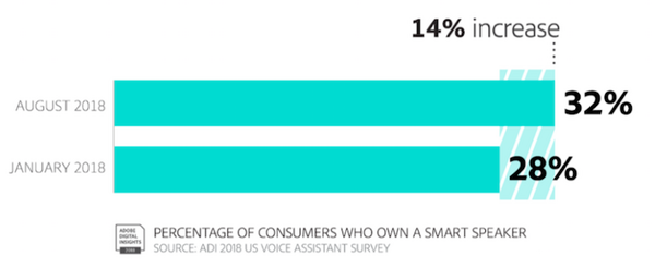 スマートスピーカーの所有率は2017年12月の28%から、2018年8月で4%増加して32%へ。