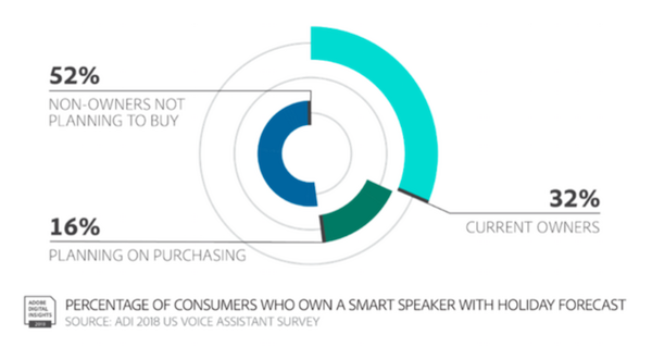 スマートスピーカーの所有率は次のホリデーシーズンで16%が新規で購入予定。結果としてホリデーシーズン後のスマートスピーカー所有率は48%に上昇すると予測している。