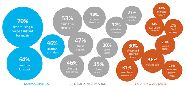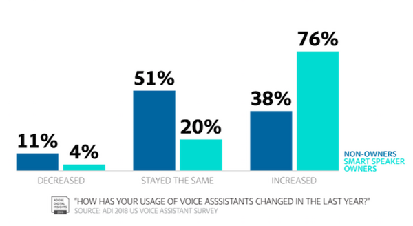音声アシスタントは一過性のブームではなく、その利用は前年を大きく上回っているという。3Dテレビ、セグウェイなどは初年度に人気が爆発したが、その後の利用は低下していたというが、それと比較して、スマートスピーカー所有者は去年により使わなくなった人は4%、去年より使ったという人は76%と大きく向上している。またスマートスピーカー非所有者でも音声アシスタントの利用は38%は増えたと回答している。