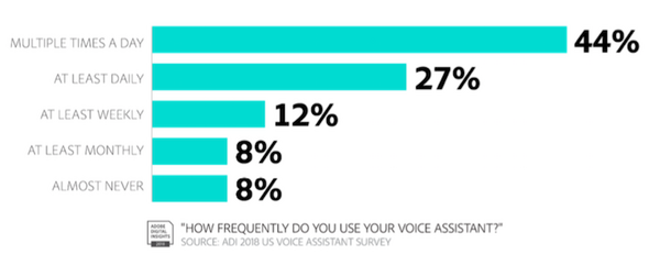 スマートスピーカー所有者の71%は少なくとも毎日利用し、そのうち44%は1日に何回も使うと回答した。一方、殆ど使わないと回答したのはわずか8%だった。所有者は定期的に利用しているとみていいだろう。