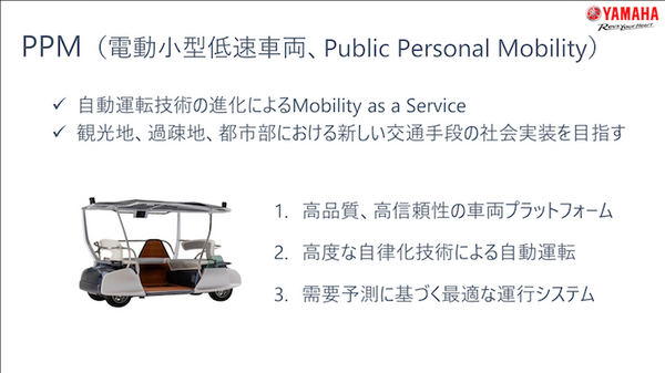 二つ目の製品は、「PPM」とヤマハ発動機が称する、電動の小型低速車両だ。プラットフォームとして活用するのはゴルフカーの車体。ヤマハ発動機はゴルフカーにおいて、世界シェア約30%、国内シェア80%を持つ。