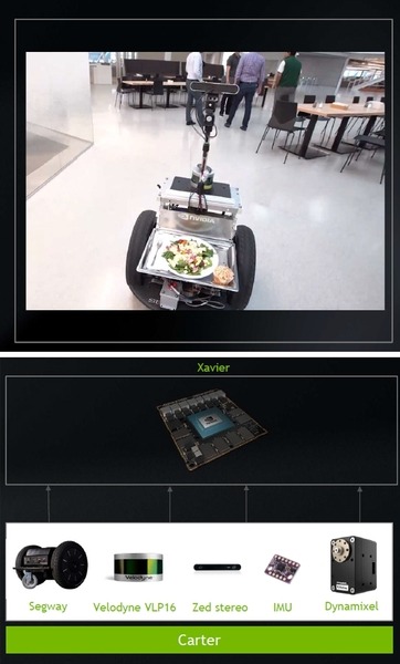 カーターはエンデバーの中で、スマートフォンで呼び出され、指示された場所に自律的にモノを自律的に運ぶデリバリー作業を行っている。人や障害物を避け、エレベータに乗って上下階に移動することもできる。NVIDIAはエレベータ会社と連携して、Wi-Fi通信でカーターの意思がエレベータに対して伝えられるしくみだ。