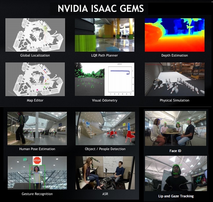 「ISAAC SDK」には、マッピング、自己位置推定、認識、マップエディタ、LQR パスプランナー、ビジュアルオドメトリ、経路探索、奥行き推定(測距)、物理シュミレーション、人物姿勢推定、ジェスチャー認識、人物認識、音声認識など、自律ロボット開発や移動マシン(自律モビリティ)の開発に重要となるアルゴリズムや有用なライブラリがラインアップされる。このライブラリ群をNVIDIAでは「GEMS」(ジェムズ)と呼んでいる。