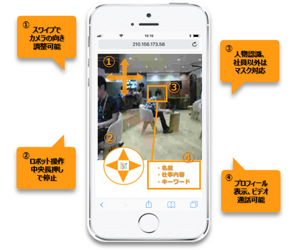 ロボットの操作は、スマートフォン画面の左上をスワイプすることで、カメラの向きを調節を行い、画面左下のボタンで筐体を操作し、社員を認識させると、「名前・仕事内容・キーワード」といったプロフィール情報を閲覧したうえでビデオ通話を開始することが可能。