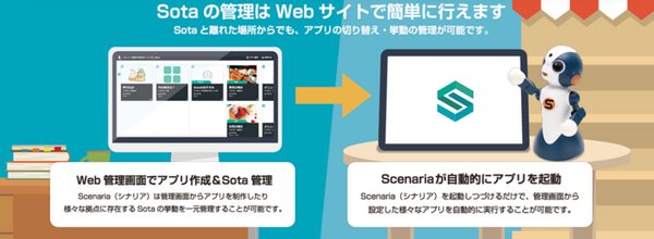 「Scenaria for ロボコネクト用Sota」は、開発の経験がないビジネスの主管部署でもコンテンツの更新ができるソリューションが重要と考えた、株式会社フライトシステムコンサルティングが提供するsota専用の法人向けクラウドサービスだ。