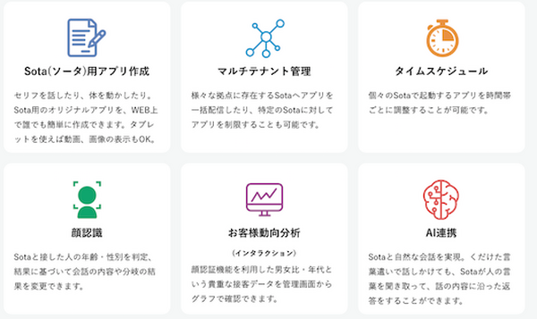 このサービスを導入することで、Sotaに「オリジナルのセリフを喋らせたり」「体を自由に動かしたり」等、Sota用のオリジナルアプリを、WEB上で簡単に作成することができるという。他にも、個々のSotaで起動するアプリを時間帯ごとに指定したり、Sotaと接した人の年齢・性別を判定し、結果に基づいて会話の内容や分岐の結果を変更できたり、顔認証機能を利用した男女比・年代という接客データを管理画面からグラフで確認することができる。