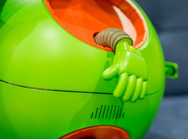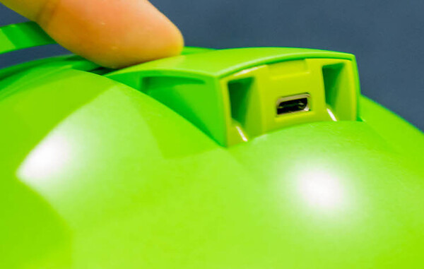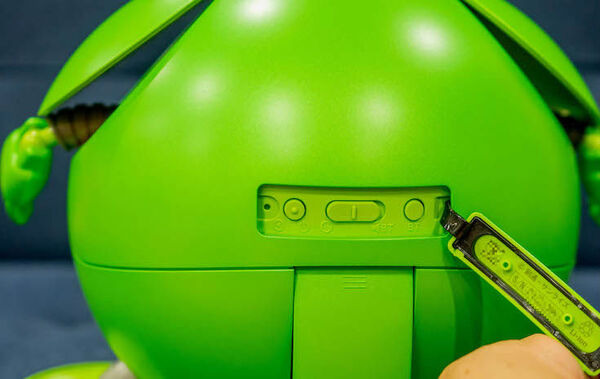 見ての通りなんですが、開閉可能部を開けて手足を出すと一気に可愛い感じになります。口の部分にはLEDが埋め込まれています。またマイクは頭頂部に3つ。スピーカーは本体左右にあります。また充電時に光るLEDなどもボディサイドに埋め込まれています。