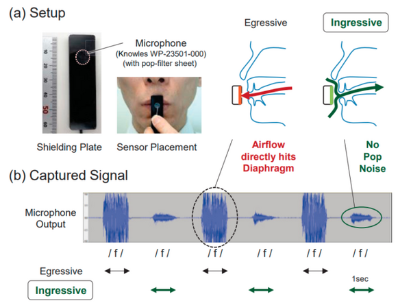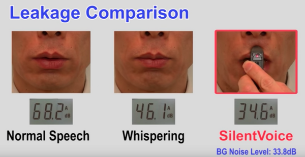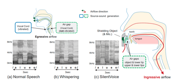 サイレントボイスは、周りに音が聞かれずに音声認識による音声制御を可能にするコンセプト。息を吐き出しながら発話する(Egressive speech)のが通常だが、息を吸いながら発話する(Ingressive speech)を使うことで実現するというもの。