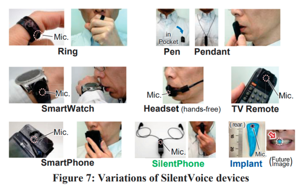 またサイレントボイスのために必要なマイクは小型化もできるため、応用例として、腕輪、ペンダント、スマートウオッチ、ヘッドセット、テレビリモコン、スマートフォン、サイレントフォン、インプラントの歯などにマイクを埋め込むイメージも紹介された。