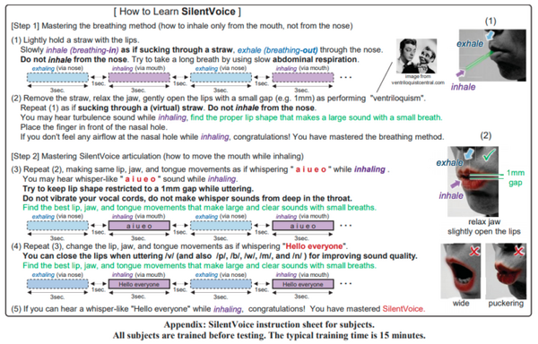 このサイレントボイスを発話するためには論文によれば、15分程度練習すれば誰でも息を吸いながら発話できるようになるという。
