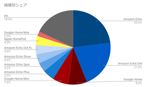 機種をまとめてメーカー別として円グラフにしたもの。これを見ても米国ではAmazonのシェアが依然として大きいことがわかる。Apple HomePodも4%のシェアをとっていることもわかる。