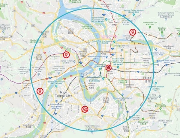 直径15キロ圏内(水色の円)に入ってしまうSESAMEの部品を製造する各工場。円の中心から少し東にずれた地点にある台北駅(二重丸)から車で30分も走ればどの工場もついてしまう距離感だ。