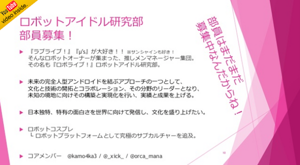 このような活動を行う「ロボットアイドル研究部」では、部員を広く募集しているという。入部希望の方は、カモシカ氏のツイッター(@kamo4ka3)かメールアドレス( kamo4ka3@gmail.com )までお問い合わせを。