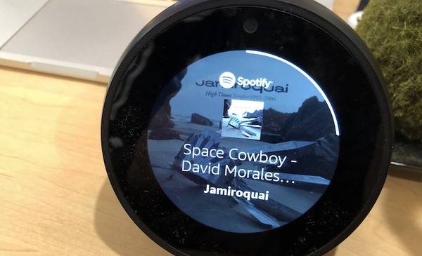 Echo Spotで試したのだが、画面にアルバムジャケットイメージも表示される。ただし、Amazon Musicであれば一部の曲は歌詞も画面に表示されるため、Echo Spot/Echo Showユーザーで歌詞を見たい場合は、Spotifyでは現時点では不満を感じるかもしれない。