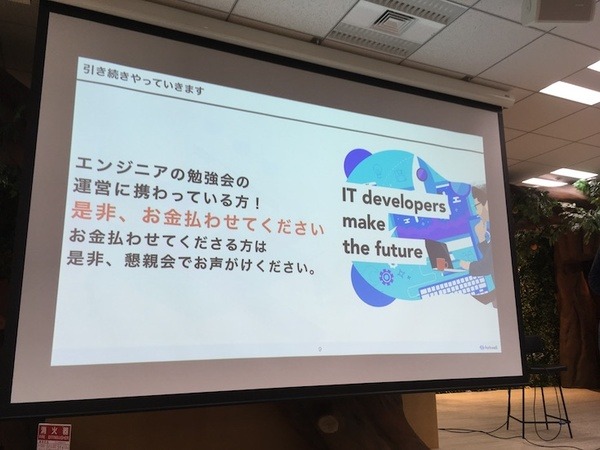 イベントスポンサーは、サイボウズさんとforkwellさん。会場のサイボウズさんはいろんな動物のぬいぐるみがあるステキなオフィスです。