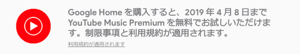 なお、現在Google Home / Google Home Miniを購入すると「2019年4月8日までYouTube Music Premiumを無料で試せる」キャンペーンもあるため、安く買った上で音楽ストリーミングサービスをしばらく無料で楽しめるのでますますお得だ。